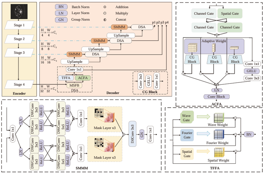 为了解决Transformer 解码器在捕获边缘细节、识别局部纹理以及建模空间连续性方面的局限,本文提出了一种面向医学图像分割的全新解码器框架,由三个核心模块组成。首先,自适应交叉融合注意力(Adaptive Cross-Fusion Attention,ACFA)模块将通道特征增强与空间注意机制相结合,并引入三个方向(平面、水平与垂直)的可学习引导,以增强模型对关键区域与结构方向的响应能力。其次,三重特征融合注意力(Triple Feature Fusion Attention,TFFA)模块融合空间域、傅里叶域与小波域特征,实现频率-空间的联合表征,从而在保留边缘与纹理等局部信息的同时,加强全局依赖与结构建模,尤其适用于结构复杂与边界模糊的场景。最后,结构感知多尺度掩蔽模块(Structural-aware Multi-scale Masking Module,SMMM)通过利用多尺度上下文与结构显著性过滤来优化编码器与解码器之间的跳跃连接,有效减少特征冗余并提升语义交互质量。三者协同工作,不仅弥补传统解码器的不足,还能显著提升肿瘤分割、器官边界提取等高精度任务的表现,提高分割精度与模型泛化能力。实验结果表明,该框架为医学图像分割提供了一种高效且实用的解决方案。