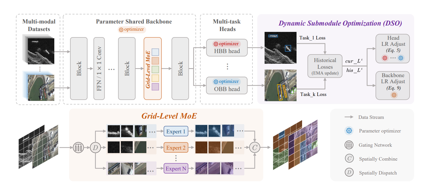 随着遥感技术的迅速发展,高分辨率多模态图像如今更易于获取。传统的目标检测模型通常基于单一数据集进行训练,往往局限于特定的成像模式和标注格式。同时,多模态目标检测忽视了多模态之间的共享知识,并限制了模型在更广泛场景中的适用性。本文提出了一项新的任务,即针对遥感的多模态数据集和多任务目标检测(M2Det),旨在从任何传感器模态中准确检测水平或定向目标。这一任务面临挑战,原因在于多模态建模表达能力的限制,以及多任务优化的复杂性。为解决这些问题,本文建立了一个基准数据集,并提出了一个统一模型 SM3Det(用于多模态数据集和多任务目标检测的单模型)。SM3Det 利用网格级稀疏 MoE 主干网络实现联合知识学习,同时保留不同模态的特征表示。此外,本文提出了一种新颖的一致性和同步优化机制,使其能够有效应对不同模态和任务的学习难度差异。大量实验表明,SM3Det 具有高效性和通用性,在各个数据集上始终优于专门模型的组合。