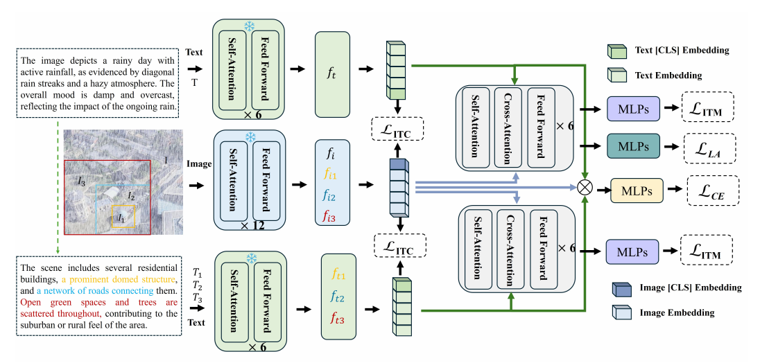 本文针对无人机视觉地理定位在雨、雾等天气干扰下性能骤降的问题,指出现有方法存在有限天气类别导致泛化性不足和伪天气类别导致场景气特征不清晰两大问题,提出了适用于全天气无人机视觉地理定位的WeatherPrompt多模态表示学习方法。该方法借助现成多模态大模型,结合思维链(CoT)提示生成多天气文本描述,再通过文本嵌入驱动的动态门控多模态框架实现场景与天气特征的解耦,并引入图像-文本对比、匹配等跨模态损失方式以优化模型。大量实验表明,该方法在 University-1652、SUES-200 数据集及真实世界场景中均超越SOTA方法,在夜间场景Recall@1提升13.37%,雾雪场景提升18.69%,在混合未见过的天气(黑暗+雨+雾)中也实现了72.15%的AP,为航空地理定位的语言驱动先验应用提供了新范式。