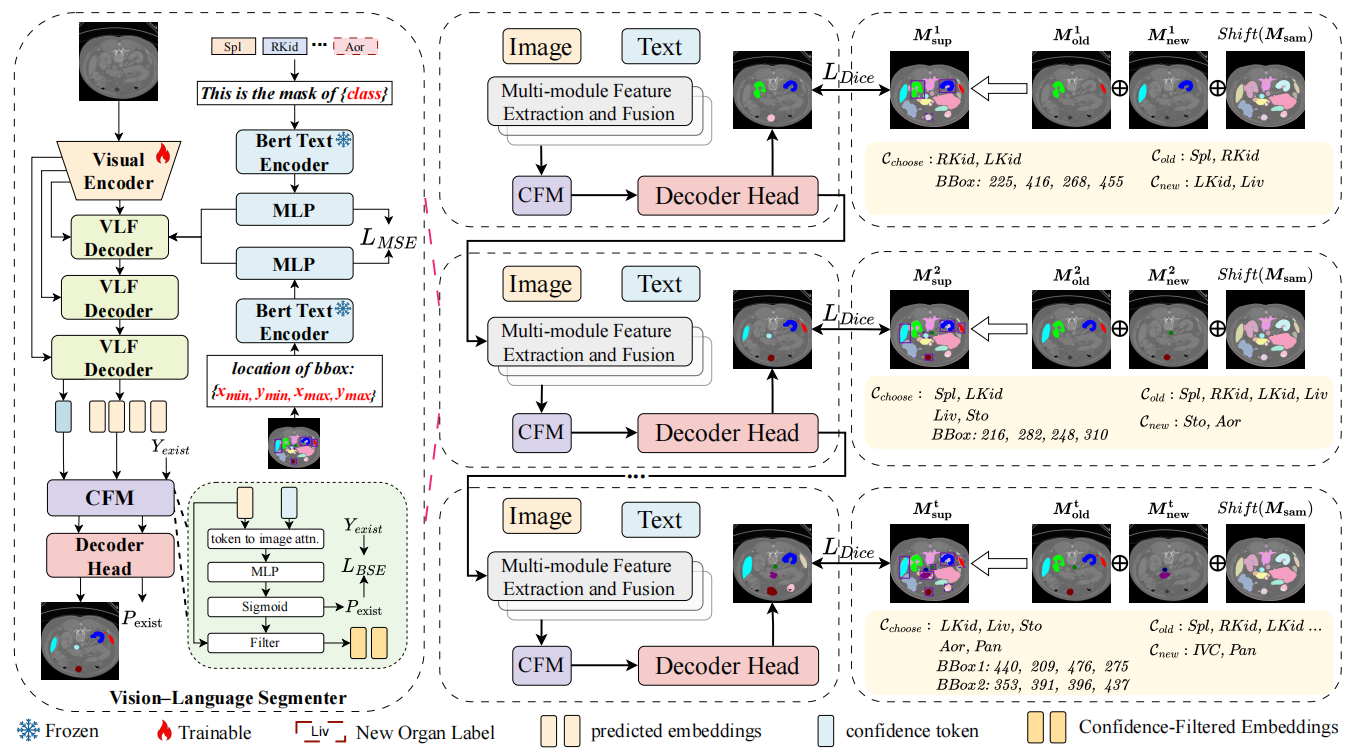 在医学人工智能的实际部署中,模型常面临新旧任务更迭带来的灾难性遗忘挑战。由实验室提出的PriCL-Seg框架针对这一痛点,构建了一套基于视觉语言模型(VLM)驱动的无存储持续学习体系。该工作设计了一种创新的伪标签引导知识回放机制,巧妙地融合了历史模型预测、新类标注以及 Segment Anything Model (SAM) 提供的结构先验。这种三位一体的监督信号在不存储任何历史病例数据的前提下,有效缓解了跨模态语义漂移。为了应对文本提示可能带来的噪声,研究进一步引入了置信度引导过滤模块(CFM),动态抑制低置信度的误导性预测,确保了模型在多轮任务增量后的鲁棒性。