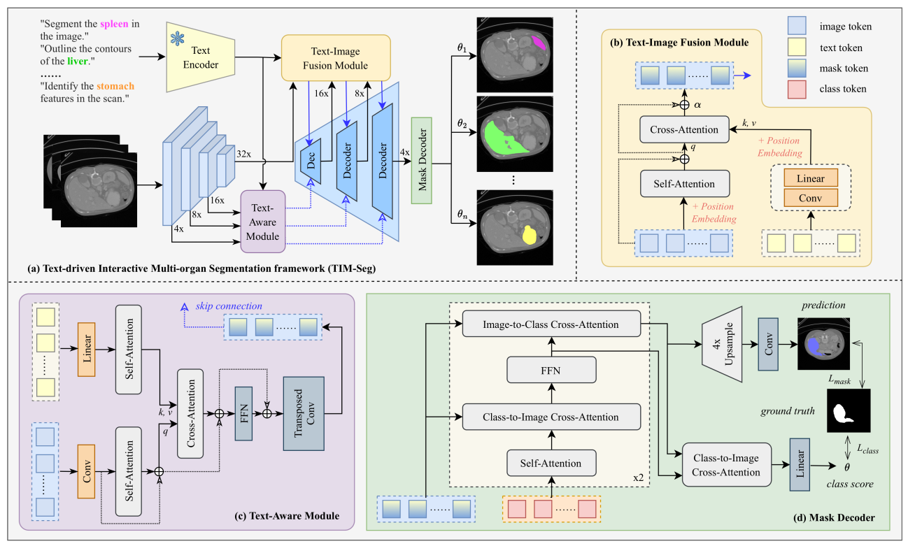 针对腹部 CT 影像中器官边界模糊、对比度低导致的分割难题,实验室推出了TIM-Seg框架。该研究尝试将深奥的解剖学文本知识转化为模型可理解的视觉导航。不同于将文本作为被动补充的传统方法,TIM-Seg 提出了双阶段影像-文本融合机制。通过文本-图像融合模块(TIFM)实现多尺度跨模态对齐,并利用文本感知模块(TAM)将PubMedBERT提取的专业领域知识注入视觉特征重建过程。研究引入了可学习的器官特异性类词元(Class Tokens),在嵌入空间中显式建模不同器官的形态差异,极大地改善了形态相似器官之间的区分度。