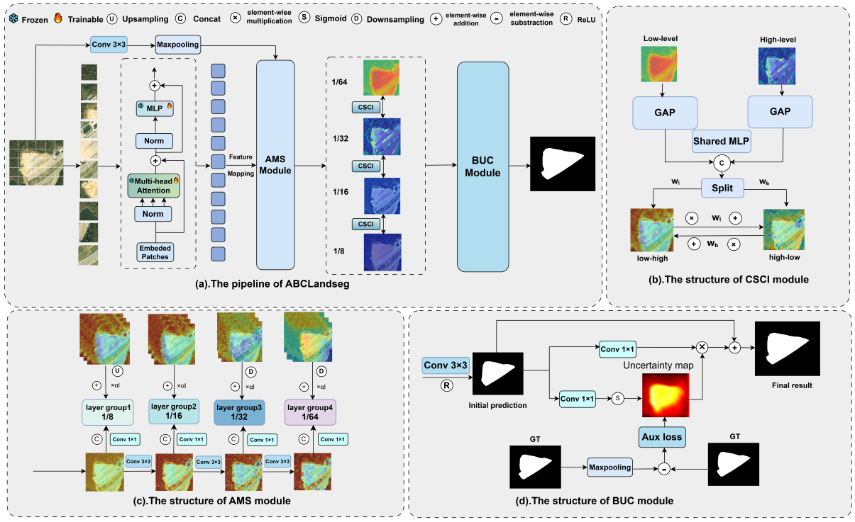 在环境安全领域,实验室将视角转向了遥感影像中的滑坡灾害自动分割。针对滑坡目标尺度多变、边界与周围地物(如裸土)极易混淆的问题,提出了ABC-LandSeg框架。该框架通过在冻结的DINOv3基础模型中注入轻量化重校准模块,实现了对地理空间特征的高效提取。研究设计了自适应多层特征选择模块(AMS),能够根据输入图像动态调整不同Transformer层的权重,以应对滑坡体从数米到数千米剧烈波动的尺度挑战。此外,针对边界模糊问题,引入了边界不确定性修正头(BUC),利用不确定性引导模型对边缘区域进行精细化微调。